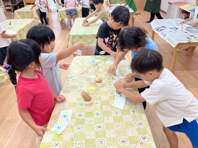4歳児ばら組がれんこん・小松菜・ピーマン・オクラ・ゴーヤの夏の野菜を使って野菜スタンプをしました。野菜ごとに押した時に出てくる形の違いを楽しみながら個性豊かな作品を作っていましたよ♪