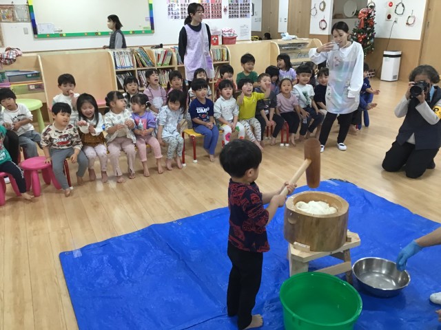 お餅つきを行いました♪お餅つきの由来やどうして年末に行うのか、そして鏡餅の意味を伝え、つくし組からさくら組までお餅をつきました。