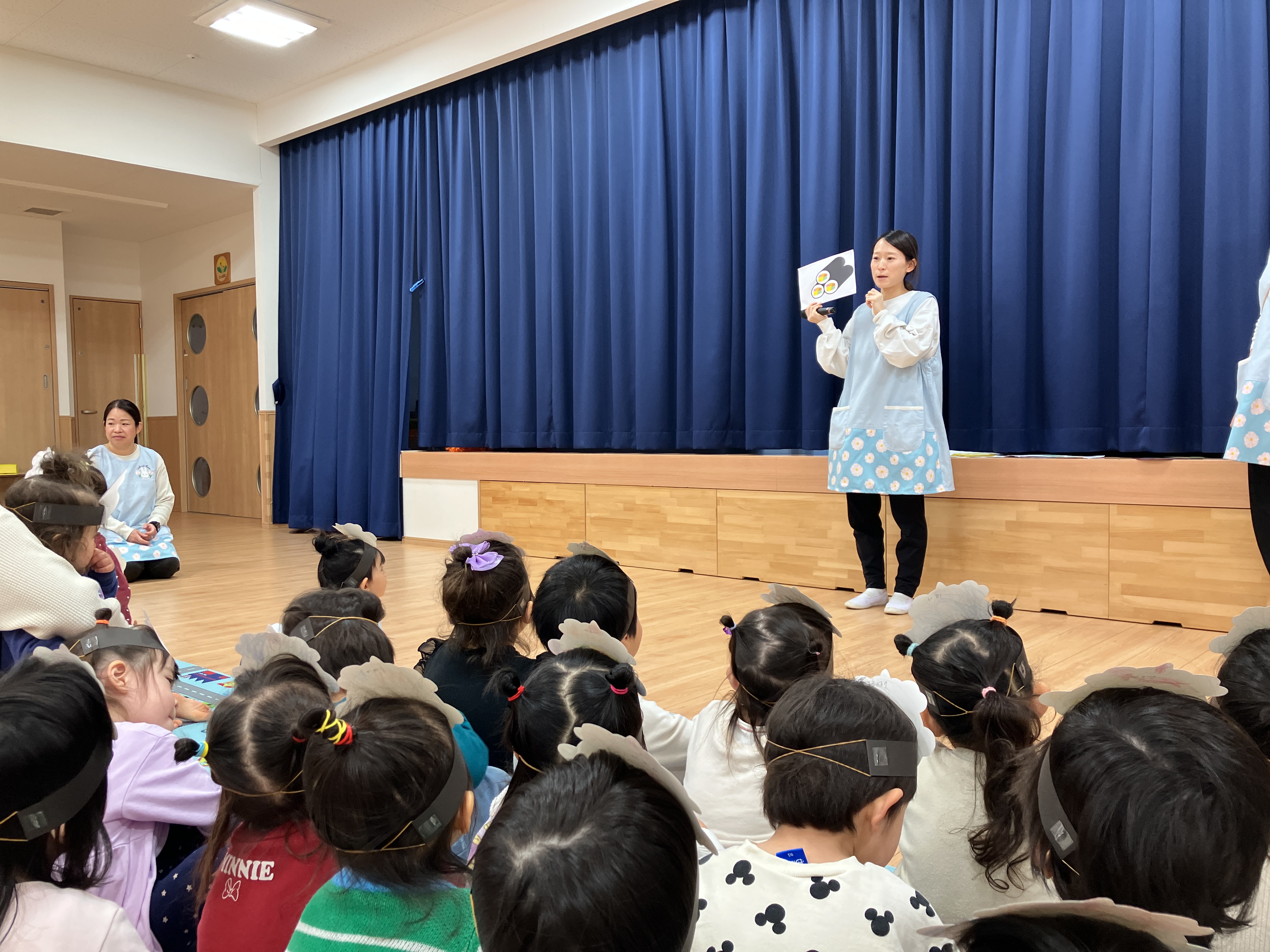 4歳児クラスは、『目 仲間の力』優しい目でお友達を応援しよう!!『かべちゃんとなみだくん』チャレンジする中で必ず出てくるカベあきらめずに行う事でもらえるプレゼントのお話でした。