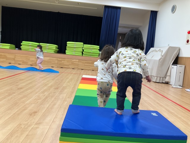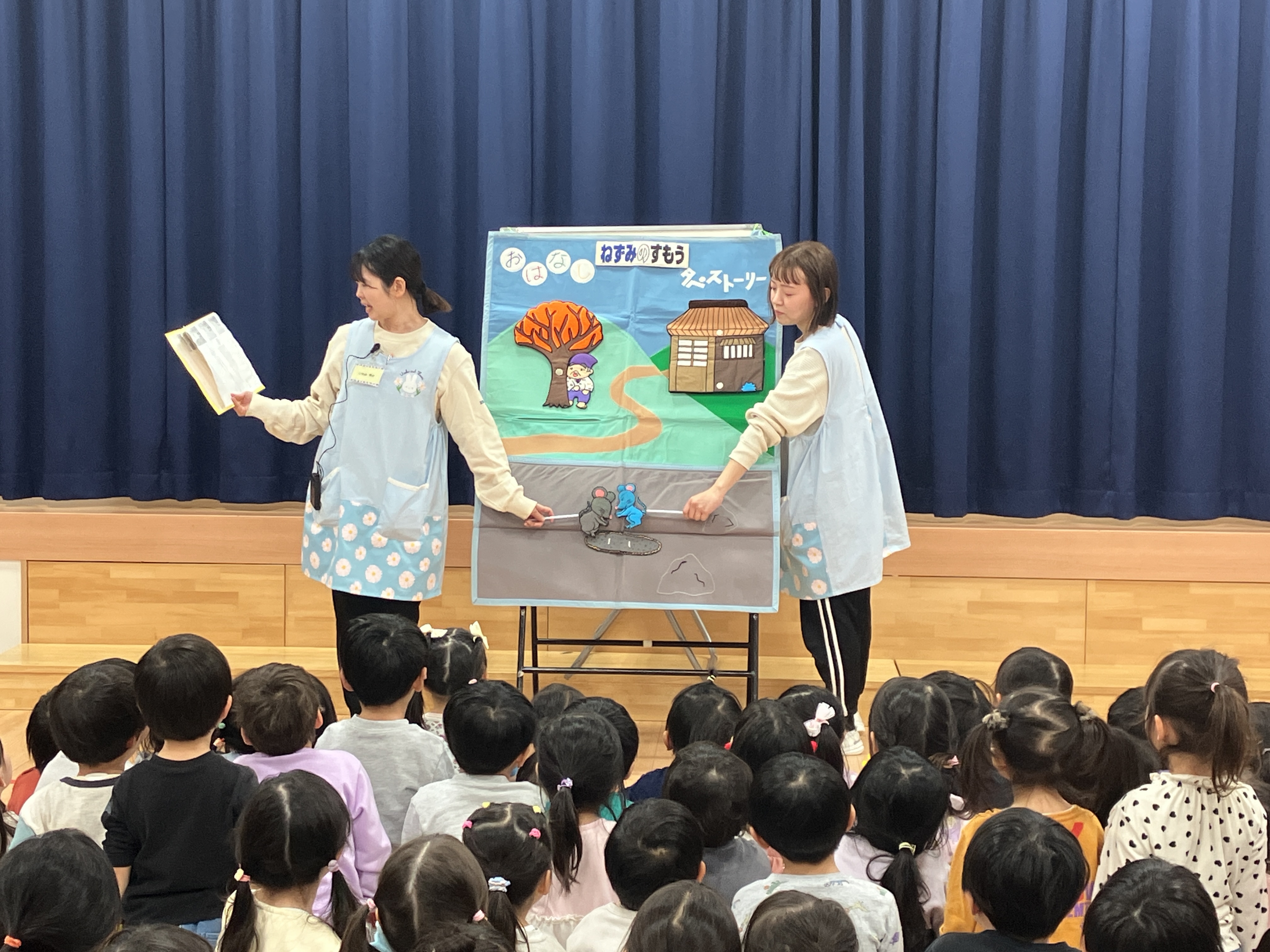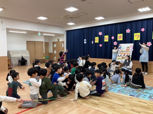 先生からのお楽しみは、「ねずみのすもう」のおはなしタペストリーでした♪ 終わった後に子ども同士で相撲を楽しむ姿も見られましたよ♪