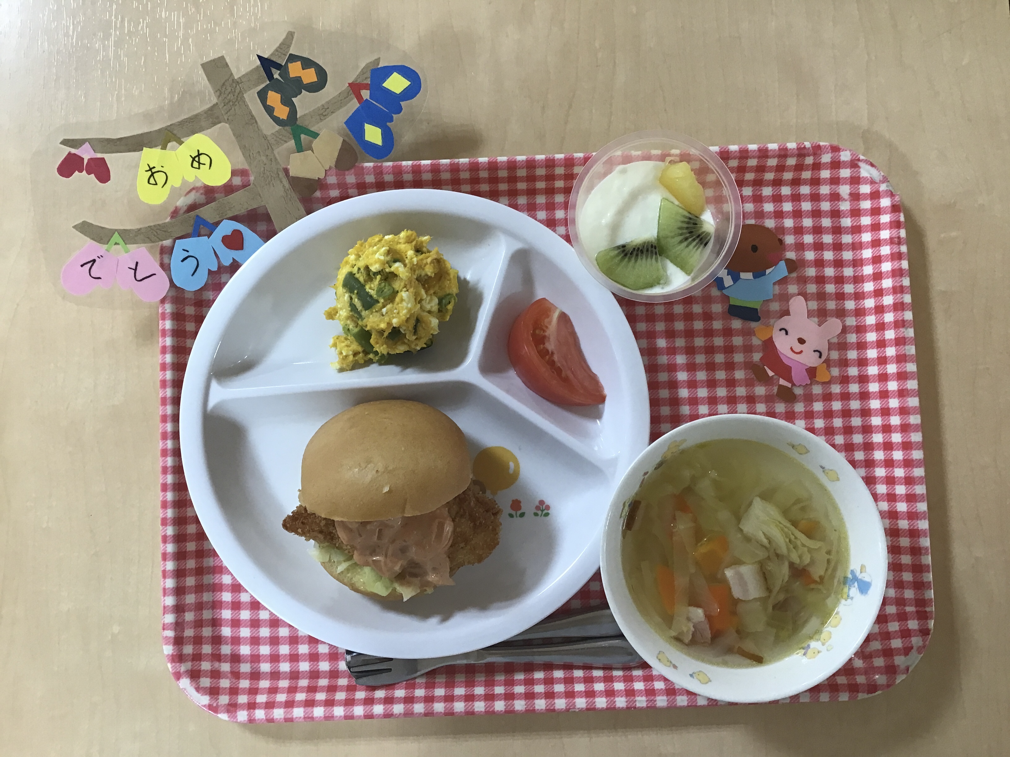 給食はみんなでホールで食べました(^^♪席札に先生達からのお祝いメッセージがあり、とても喜んでいたさくら組さんでした!