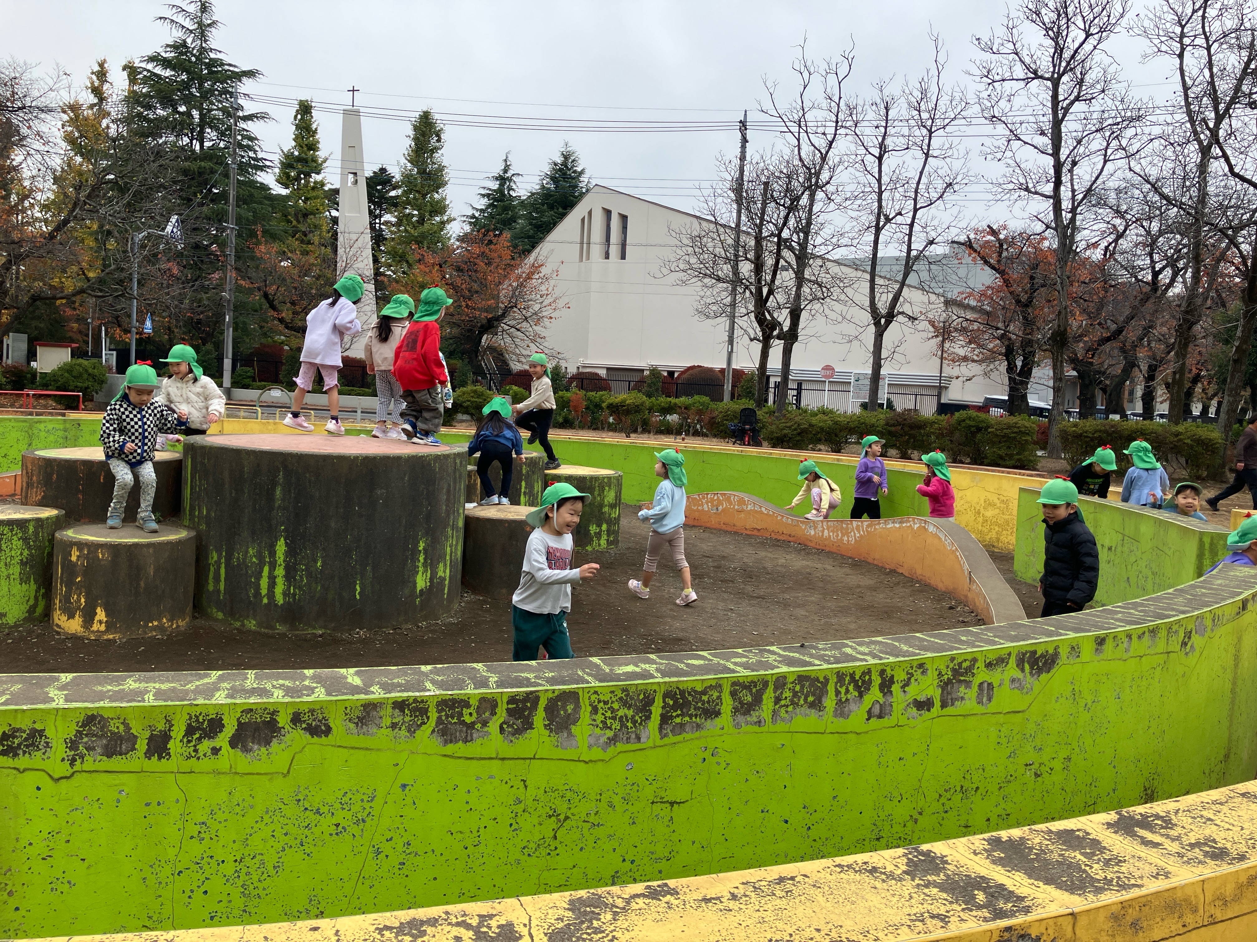 公園の中央にある迷路のような遊具でおいかけっこやかくれんぼをしたり綺麗に色づいた葉っぱや木の実を探したりと夢中になって秋探しをしていましたよ!