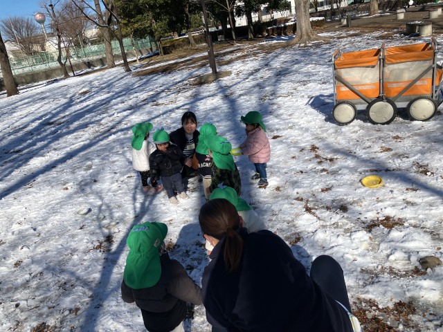 0歳児つくし組は南公園へ行き、人生初の雪遊びを楽しみました!初めて見る雪に興味津々で集まって来た子どもたち。そっと触れてみると「つめたい!」という表情で手を引っ込める姿もあり、とても微笑ましかったです。寒さもあり手で触るのは少しドキドキだったので、「ザクザク」「ギュッギュ」と雪を踏む音を楽しんだり、かわいい足跡を付けたりして遊びました。