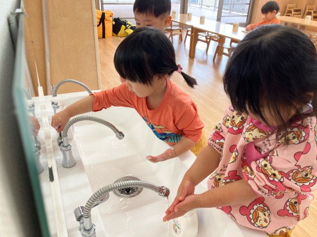 2歳児すみれ組が、看護師による手洗い指導を受けました。紙芝居で、どうして手を洗うのかな?どうやって洗ったらいいかな?という事を学び、そのあと実際に看護師の動きを真似してしっかりバイキンとバイバイできる洗い方を身につけましたよ✨
