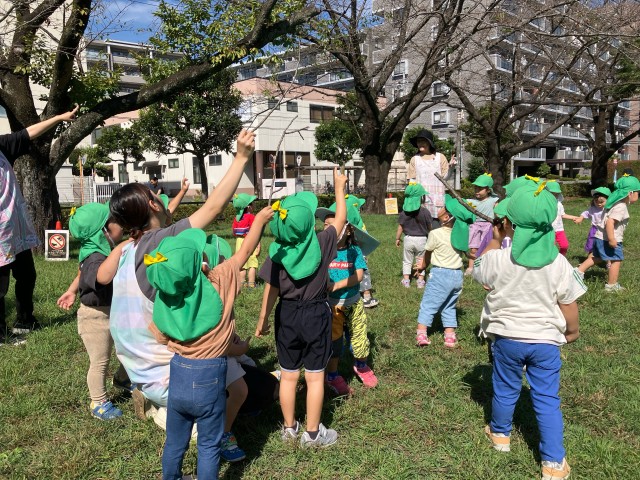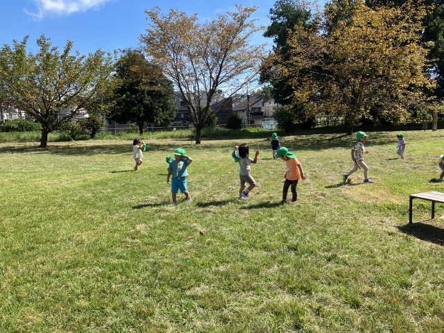 バッタがたくさんいて、みんなで走って追いかけ捕まえました!イチョウの葉や木の実などを発見し嬉しそうに見せてくれましたよ~。