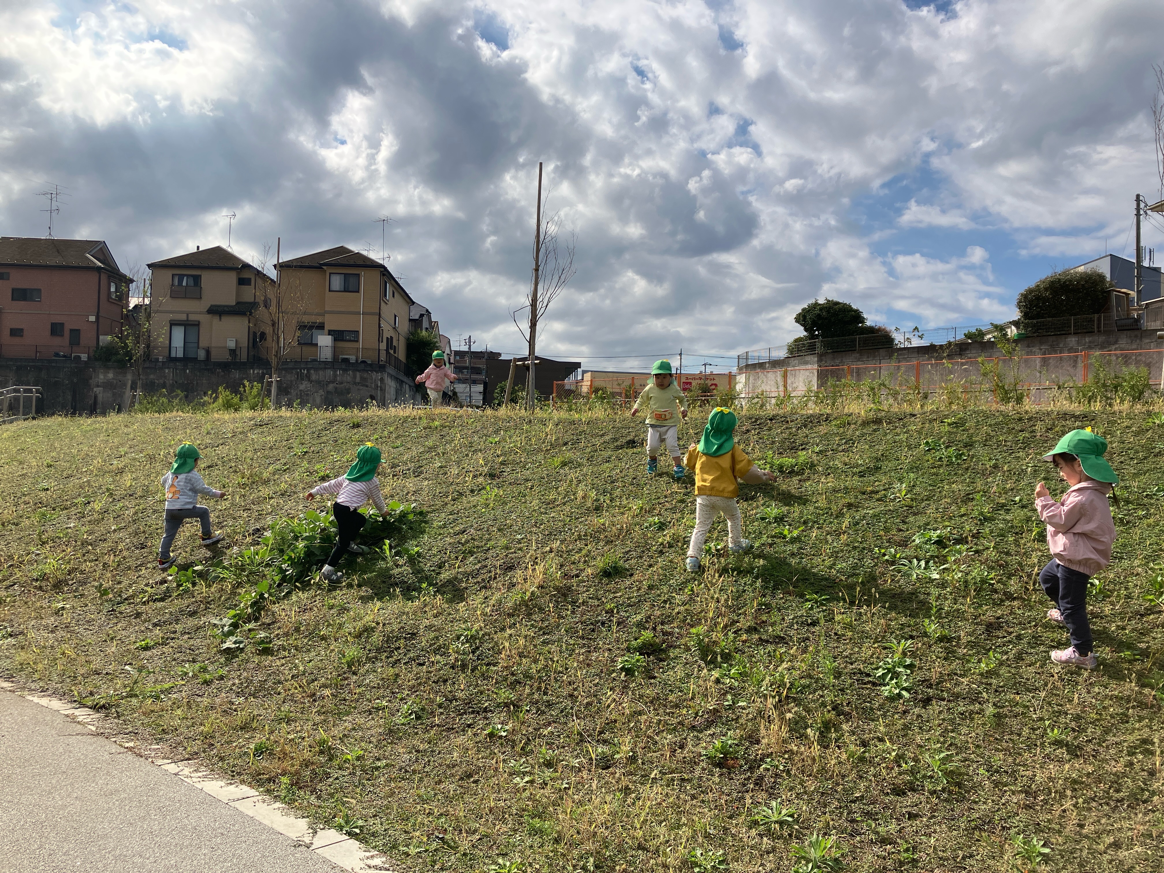 2歳児すみれ組が片道30分かけて空堀川までお散歩に行きました!遊歩道には色々な植物があり摘んで楽しんだり、坂道をみんなで駆け下りて身体を動かしましたよ♪