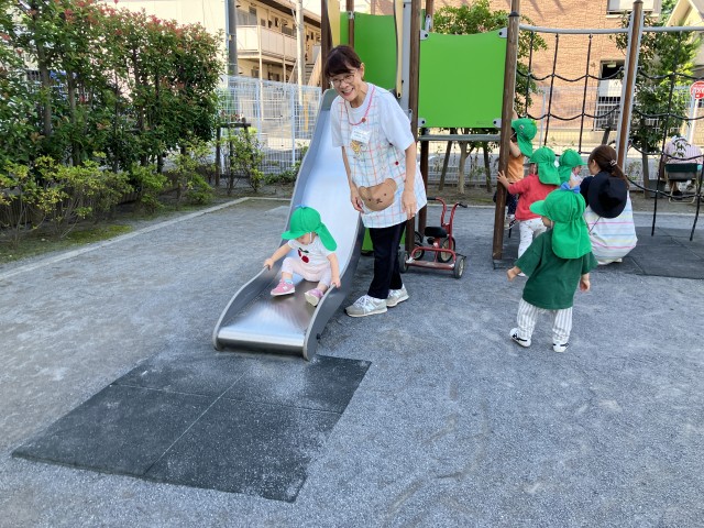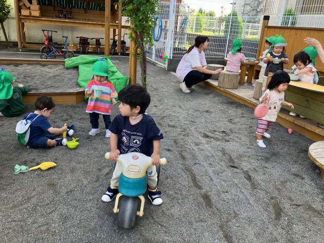 段々と涼しさを感じる日が増えてきましたね。0歳児つくし組は園庭で遊びました。上手に歩けるようになった子が増え、自分のお靴を履いて園庭へ。滑り台や砂場での砂遊びを楽しみました。1歳児たんぽぽ組さんもいたので、「どうやって遊ぶのかな」と様子を見ながらスコップなどの砂遊び玩具を使って真似っこ♪夢中になって楽しんでいましたよ!