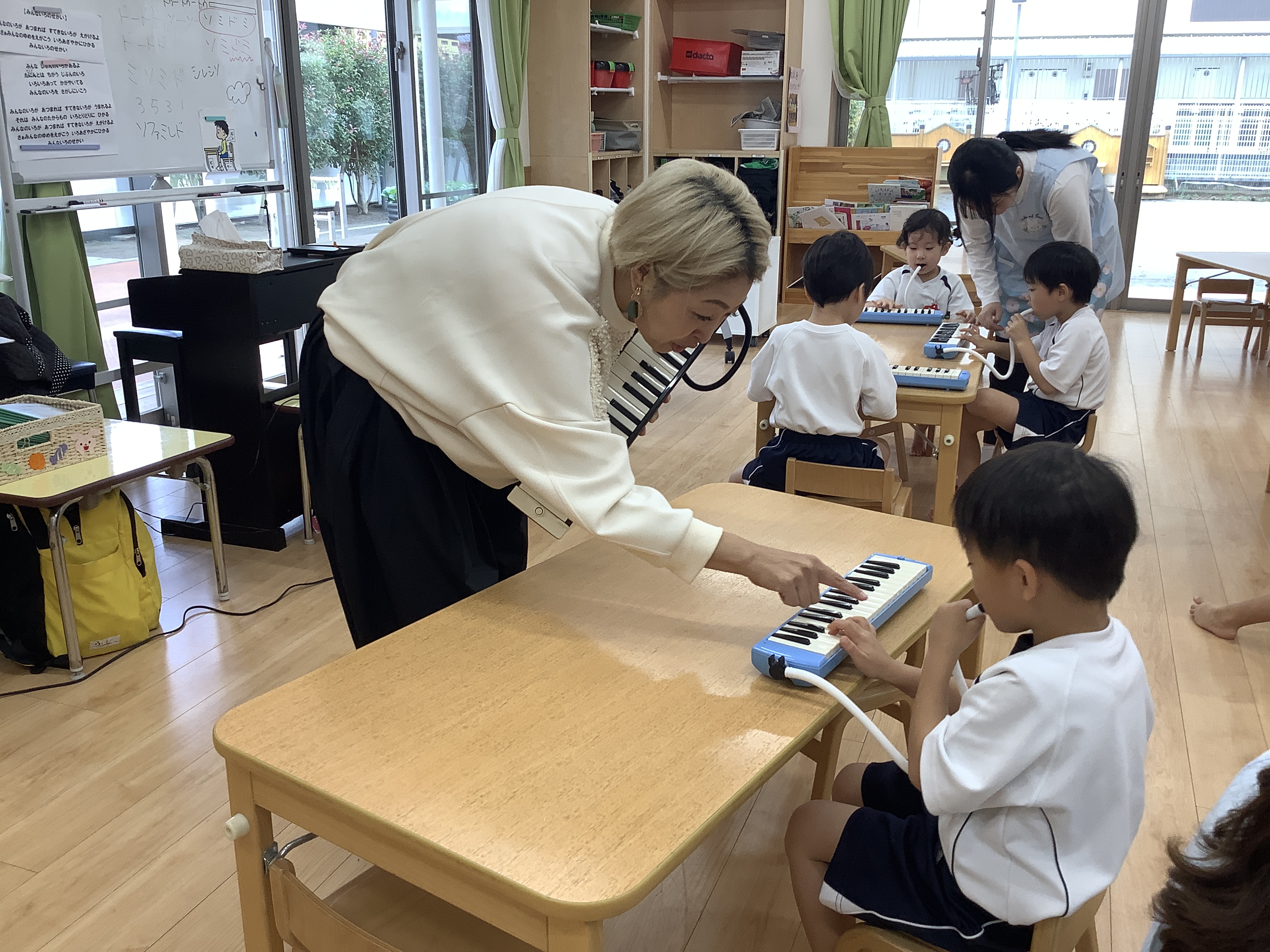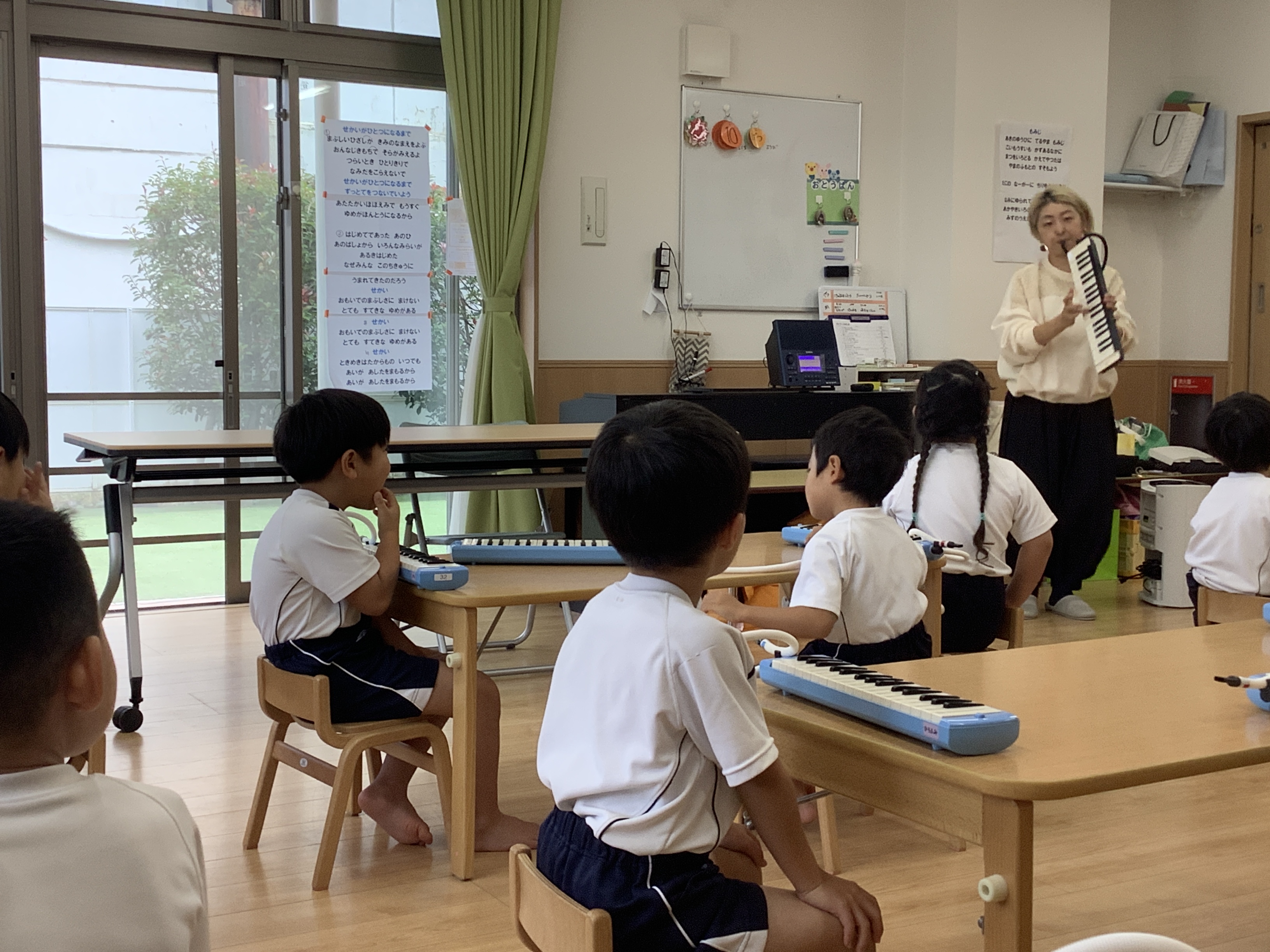 鍵盤ハーモニカ指導がありました。先月に続き約2週間ぶりの指導でした。ばら組・さくら組は先月、みほ先生に教えていただいた指の動かし方や息の入れ方を誉められとてもうれしそうな子ども達でした!!