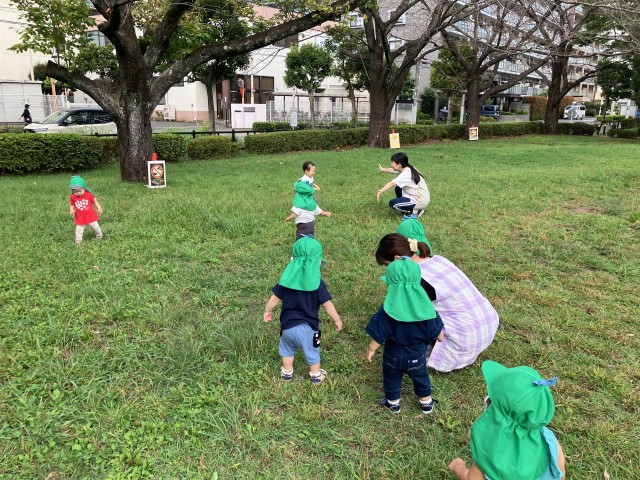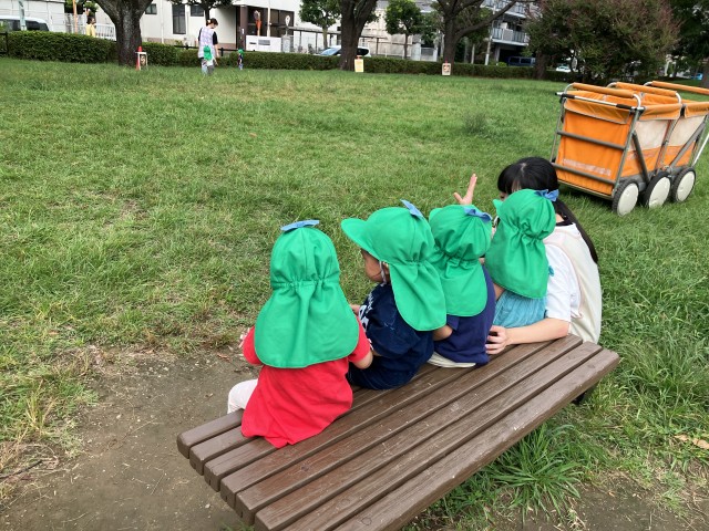0歳児つくし組です。みんなが大好きな南公園にお散歩に行きました。芝生の上を自由に歩いて動いたり、バッタやテントウムシなどを見つけたりしました。疲れたらベンチに座ってちょっと休憩…秋の風が気持ち良かったです♪