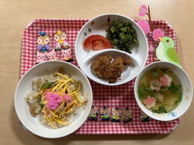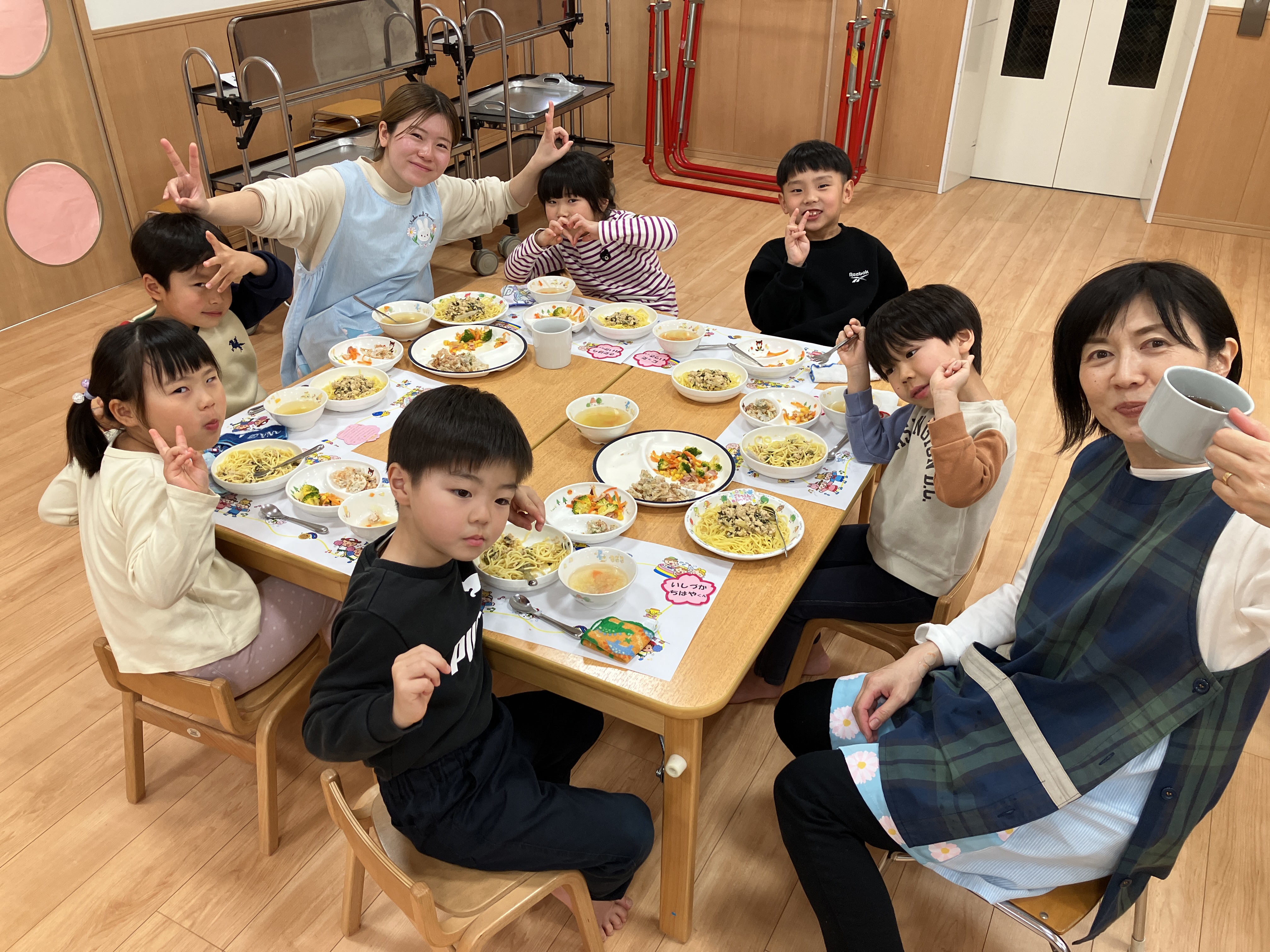 給食はみんなでホールで食べました(^^♪席札に先生達からのお祝いメッセージがあり、とても喜んでいたさくら組さんでした!