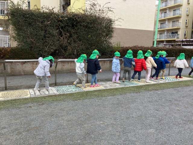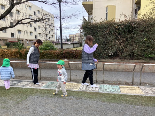 2歳児すみれ組が芝中団地の中にある公園に遊びに行きました。その公園には足つぼ体験レーンがあり、見慣れないものにみんなは興味津々!「やってみたい!」とのことで、しっかり靴を脱いで体験しましたよ♪