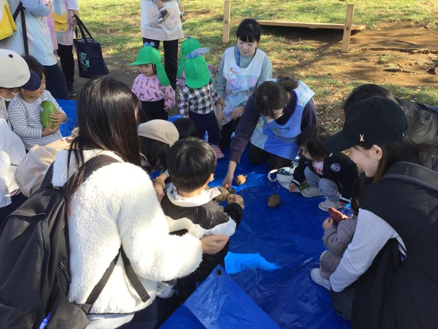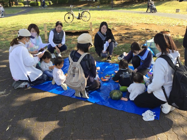 南公園で地域の方を対象に出前保育を行いました。今回は「野菜に触れてみよう♪」をテーマにさつまいもやかぼちゃ、じゃがいも、里芋や冬瓜など様々な種類の野菜を用意しました!普段あまり触れることのない生の野菜に興味津々で触ったり持ってみたりと楽しんでくれていました。栄養士も参加し離乳食の作り方や給食のレシピを配布したり、食事の悩み事についても話をすることができました。